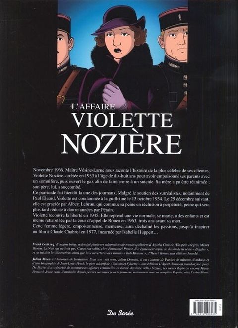 Novembre 1966. Maître Vésine-Larue nous raconte l'histoire de la plus célèbre de ses clientes, Violette Nozière, qui fut arrêtée en août 1933, à l'âge de dix-huit ans, pour avoir empoisonné ses parents avec un somnifère, puis avoir ouvert le gaz dans l'appartement afi n de faire croire à un suicide. Sa mère avait pu être réanimée ; son père, lui, était mort. Ce parricide se retrouva très vite à la une des journaux et déchaîna les passions. Malgré le soutien des surréalistes, et notamment de Paul Éluard, Violette fut condamnée à la guillotine le 13 octobre 1934. Le 25 décembre de la même année, le président Albert Lebrun la gracia, commuant la peine de mort en réclusion à perpétuité. Le maréchal Pétain ayant réduit sa peine à douze années, Violette Nozière recouvrit la liberté le 29 août 1945. Elle retrouva une vie normale, se maria, eut des enfants et fut fi nalement réhabilitée par la cour d'appel de Rouen le 18 mars 1963, trois ans seulement avant sa mort. Fille légère, parricide, empoisonneuse, menteuse : qui était réellement Violette Nozière, incarnée par Isabelle Huppert en 1977 dans le film de Claude Chabrol ?