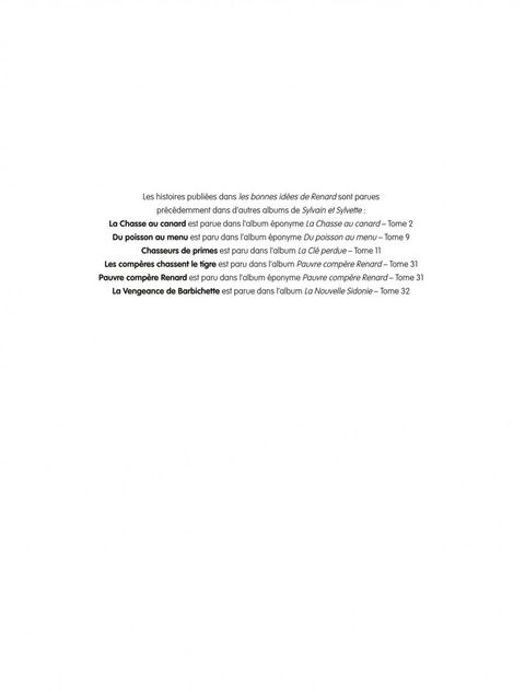 Dans ce sixième tome des intégrales de Sylvain et Sylvette, retrouvez nos deux héros, leurs amis les animaux de la forêt, mais aussi les Compères pour de nouvelles aventures pleines de rire et de malice. Avec Les Bonnes Idées de Renard, bêtises et courses-poursuites sont au rendez-vous !