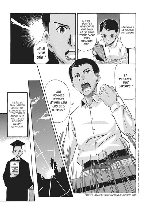 <div style="text-align: justify;">Célèbre défenseur de la paix, Gandhi a consacré une grande partie de sa vie à lutter contre la non-violence, pour une société plus juste. Né en Inde dans une famille aisée, Mohandas Karamchand Gandhi part en Angleterre faire des études d’avocat, avant d’accepter une mission en Afrique du Sud. Sur place, il découvre la discrimination raciale dont est victime sa communauté et décide de mener un combat pour faire évoluer les mentalités et les lois. De retour dans son pays natal, alors colonie britannique, Mahatma Gandhi (« grande âme » en sanskrit) rassemble son peuple et devient le porte-parole des plus démunis. Il lance alors une campagne de lutte non-violente et de désobéissance civile afin de contrer la domination étrangère, dans le but d’obtenir enfin l’indépendance de l’Inde.</div>