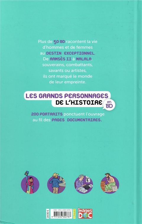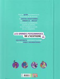 Au sommaire des bandes dessinées :<br />Jules César, Christophe Colomb, Victor Hugo, Zinédine Zidane...<br /><br />Et plus précisément :<br />• Antiquité : Ramsès II, Alexandre le Grand, Qin Shihuangdi, Jules César, Cléopâtre, Jésus.<br />• Moyen Âge : Pakal le Grand, Charlemagne, Erik le Rouge, Marco Polo, Avicenne, Guillaume le Conquérant, Aliénor d'Aquitaine, Mansa Moussa, Jeanne d'Arc.<br />• Renaissance : Christophe Colomb, Léonard de Vinci, Catherine de Médicis,<br />Henri IV, Galilée.<br />• Temps modernes : Louis IX, Molière, Kangxi, Ann Bonny, Mozart, Toussaint Louverture, Louis XVI.<br />• XIXe siècle : Napoléon, Victor Hugo, Charles Darwin, Louis Pasteur, Sitting Bull, Thomas Edison, Alexandre Graham Bell, Vincent Van Gogh.<br />• XXe siècle à nos jours : Roald Amundsen, Henri Matisse, Charlie Chaplin, Charles Lindberg, Mohandas Gandhi, Albert Einstein, Charles de Gaulle, Ann Frank, Nelson Mandela, Rosa Parks, Elisabeth II, Jane Goodal, Alan Turing, Youri Gagarine, Michael Jackson, Barack Obama, Zinédine Zidane, Malala.<br /><br />Soit plus de 50 BD complétées par 150 fiches rédigées sur d'autres grands personnages de l'Histoire.