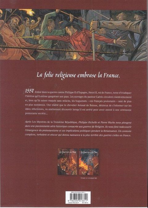 Qu'est-ce qui distingue la foi de l'hérésie ? 1557. Enlisé dans sa guerre contre Philippe II d'Espagne, Henri II, roi de France, mène un autre front : éradiquer l'hérésie qu'il estime gangréner son pays. En effet, par la complicité d'imprimeurs et de libraires hors-la-loi, les ouvrages du pasteur Calvin circulent clandestinement et, bien qu'ils soient traqués sans relâche, les huguenots - les Français protestants - sont de plus en plus nombreux. Une réalité que le chevalier Arnaud de Boissac, désireux de s'informer sur les idées réformistes, va amèrement découvrir lorsqu'il est arrêté pour avoir assisté à une cérémonie protestante secrète... Dans Les Guerriers de Dieu, passionnante série historique, Philippe Richelle et Pierre Wachs nous font redécouvrir l'émergence du protestantisme et ses implications politiques pendant la Renaissance. Un contexte complexe, turbulent et méconnu qui donna naissance à la plus terrible des guerres civiles en France.