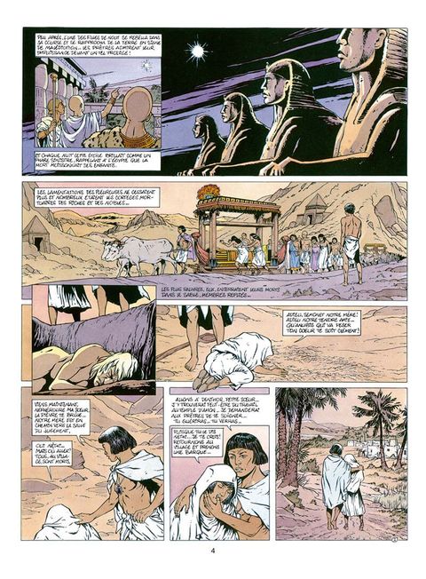 Quinze siècles avant notre ère, les Hébreux attendent la venue de Moïse le prophète... Comme un chant ayant traversé les siècles, "Les Héritiers du soleil" nous content l'histoire de peuples millénaires. Les auteurs parviennent à déjouer les pièges du péplum et décrivent avec intelligence et subtilité la vie quotidienne du peuple égyptien et l'âpre combat des Hébreux autour de l'Arche d'Alliance.