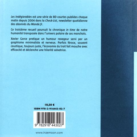 Les indégivrables est une série de bd courtes publiées chaque matin depuis 2004 dans la check-list, newsletter quotidienne des abonnés du monde.fr. Ce troisième recueil poursuit la chronique in time de notre humanité transposée dans l'univers polaire de ces manchots.