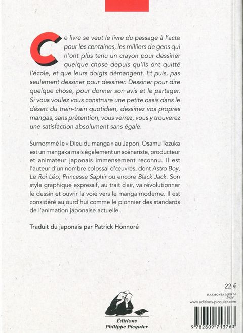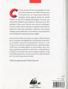 Ce livre se veut le livre du passage à l'acte pour les centaines, les milliers de gens qui n'ont plus tenu un crayon pour dessiner quelque chose depuis qu'ils ont quitté l'école, et que leurs doigts démangent. Et puis, pas seulement dessiner pour dessiner. Dessiner pour dire quelque chose, pour donner son avis et le partager. Si vous voulez vous construire une petite oasis dans le désert du train-train quotidien, dessinez vos propres mangas, sans prétention, vous verrez, vous y trouverez une satisfaction absolument sans égale. Surnommé le « Dieu du manga » au Japon, Osamu Tezuka est un mangaka mais également un scénariste, producteur et animateur japonais immensément reconnu. Il est l'auteur d'un nombre colossal d'œuvres, dont Astro Boy, Le Roi Léo, Princesse Saphir ou encore Black Jack. Son style graphique expressif, au trait clair, va révolutionner le dessin et ouvrir la voie vers le manga moderne. Il est considéré aujourd'hui comme le pionnier des standards de l'animation japonaise actuelle.