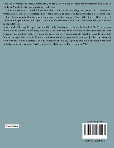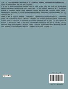 Avec Les Mohicans de Paris, Dumas écrit, de 1854 à 1859, dans Les trois Mousquetaires puis dans Le comte de Monte-Cristo, son plus long feuilleton. Il y met en scène sa comédie humaine, dans le Paris de ses vingt ans, celui de la génération romantique et de la Restauration. Les " Mohicans ", ce sont tous les déshérités de la fortune qui tentent de conquérir liberté, gloire, bonheur dans les marges d'une ville tout entière vouée à l'ambition du pouvoir et de l'argent. Leurs vies s'entrelacent autour de la figure de Salvator qui, face au redoutable M. Jackal, le chef de la police, prépare, à la tête de la Charbonnerie, la révolution de 1830. " Les romans, poète, c'est la société qui les fait ; cherchez dans votre tête, fouillez votre imagination, creusez votre cerveau, vous n'y trouverez, en trois mois, en six mois, en un an, rien de pareil à ce que le hasard, la fatalité, la providence, selon le nom dont vous voudrez nommer le mot que je cherche, vous n'y trouverez dis-je, rien de pareil à ce que le hasard, la fatalité, la providence noue et dénoue dans une nuit, dans une ville comme Paris" Dumas, Les Mohicans de Paris, chapitre VIII