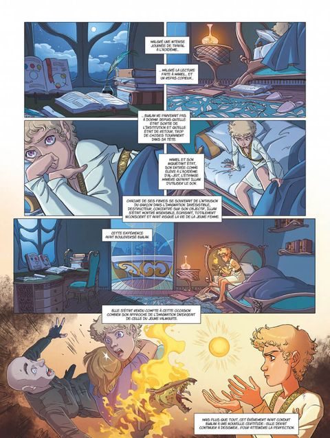 Le chef-d’œuvre de Pierre Bottero en BD !De retour dans la meilleure académie de Gwendalavir, Ewilan a recouvré toutes ses forces et le don du dessin. Déterminée, la jeune fille à la ferme intention de dépasser ses limites au sein de cette institution réputée qui forme les grands dessinateurs à même de devenir des sentinelles ! A force de travail, Ewilan pourrait développer son talent. Mais en attendant l'origine des pouvoirs d’Illian reste un mystère et la santé fragile de Maniel la préoccupe… De son côté, Salim devenu apprenti Marchombre d’Ellana n’est qu’au début de sa formation. L’enseignement à la dure risque de lui laisser quelques séquelles… Les deux amis vont devoir relever bien des défis cette année sans compter les rivalités naissantes et inattendues.L’univers de Pierre Bottero, développé en plusieurs cycles, s’est imposé comme une référence en matière de roman de fantasy pour adolescents. Nouveaux environnements, nouveaux dangers, nouveaux personnages, Les Mondes d’Ewilan poursuit avec brio l’aventure initiée dans La Quête tout en creusant la psychologie adolescente de nos héros.