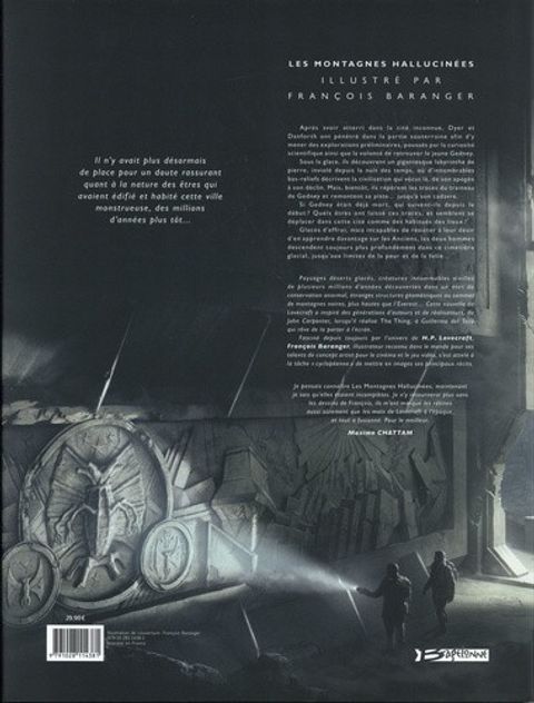 Deuxième partie des « Montagnes Hallucinées » illustrée par François Baranger, techniquement irréprochable. Ses illustrations sont ce qui se rapproche le plus d’un film dédié à la mythologie Lovecraftienne. On poursuit l’expédition d’une cité préhumaine découverte en antarctique. Les personnages explorent les ruines en apparence abandonnées depuis des millions d’années, interprètent les (...) Voir le commentaire