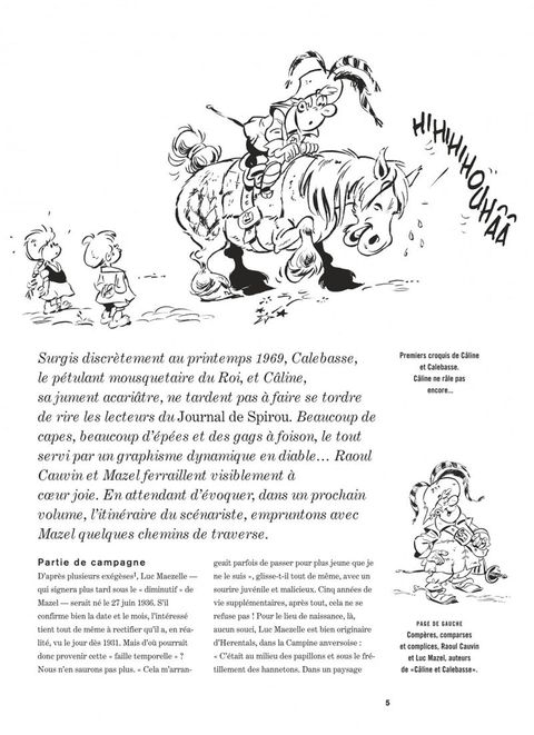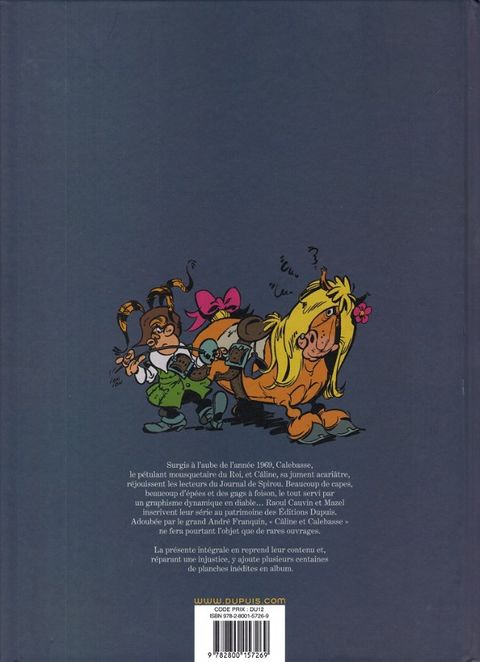 Reprend les albums 1 et 8 de la série Jeune et fringant mousquetaire, Calebasse nous fait vivre de trépidantes aventures en compagnie de sa fidèle mais non moins caractérielle jument, l'irascible Câline. Créée par Raoul Cauvin et Mazel pour le Journal de Spirou en 1969, la fi ne équipe offre une avalanche de gags et de scènes d'action qui séduisent les lecteurs du journal. Le trait fl uide et net de Mazel (qui met un point d'honneur à éviter tout anachronisme et qui fait de nombreuses recherches historiques pour cette série) permet à Raoul Cauvin de laisser libre cours à son humour et à sa fantaisie débridée. Malgré un succès certain, la série connaîtra peu de publications en album - ce qui explique que nombre d'histoires courtes de Câline et Calebasse soient depuis longtemps devenues introuvables. Cette intégrale vient combler ce manque, en réunissant, dans le présent volume, des histoires au long cours telles que Les Mousquetaires, Les Joyaux de la reine, ou encore À l'ombre de la Bastille; des histoires courtes comme Le Diamant noir ou Les Mousquetaires du printemps ; ainsi que des illustrations et des couvertures parues dans Le journal de Spirou.