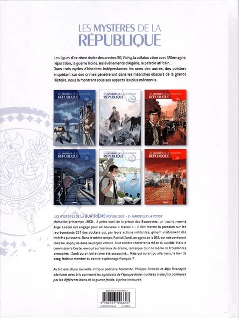 Marseille, printemps 1950. À peine sorti de la prison des Baumettes, un truand nommé Ange Casoni est engagé pour un nouveau « travail » : il doit mettre la pression sur les représentants CGT des dockers qui, par leurs actions militantes, gênent visiblement des intérêts puissants. Dans le même temps, Patrick Zardi, un agent de la DST, est retrouvé mort chez lui, asphyxié dans sa propre voiture. Tout semble conforter la thèse du suicide. Mais le commissaire Coste, envoyé sur les lieux du drame, remarque tout de même de troublantes anomalies : Zardi aurait bel et bien été assassiné… Mais qui aurait pu aller jusqu’à tuer de sang-froid un membre du contre-espionnage français ?Au travers d’une nouvelle intrigue policière haletante, ce deuxième opus des Mystères de la 4e République nous montre cette fois comment les syndicats de l’époque étaient utilisés à des fins politiques par les différents blocs de la guerre froide, à peine instaurée. Cette série s'affirme d'ores et déjà comme un best-seller avec près de 80 000 exemplaires vendus en moins d'un an !