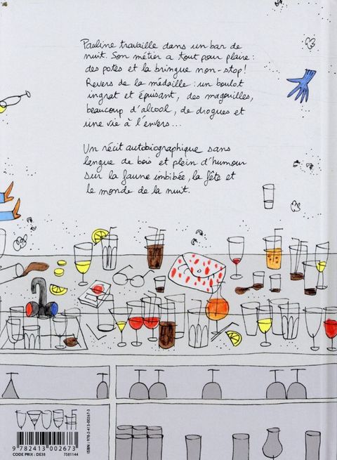 Être barmaid, c'est cool : des potes et la bringue nonstop ! Mais c'est aussi une vie à l'envers : un travail ingrat et épuisant, des magouilles, beaucoup d'alcool, de drogue. Pauline pète les plombs et finit par changer de vie loin de ses chers noctambules. Une BD drôle et toute en finesse sur l'univers des bars de nuit, truffée d'anecdotes truculentes et de personnages hauts en couleur.