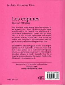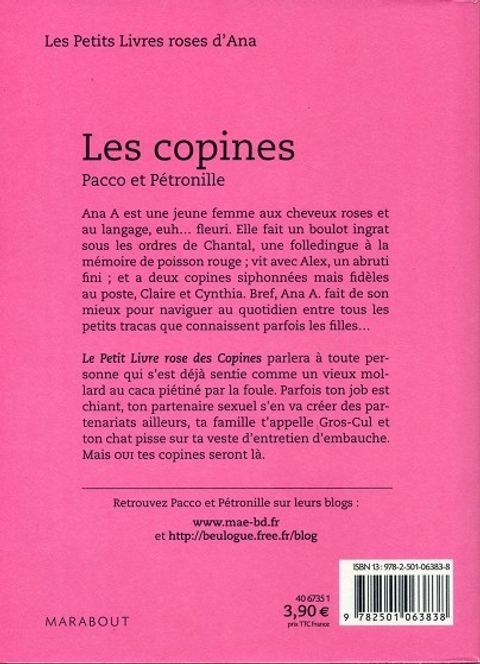 Ana A est une jeune femme aux cheveux roses et au langage, euh... fleuri. Elle fait un boulot ingrat sous les ordres de Chantal, une folledingue à la mémoire de poisson rouge ; vit avec Alex, un abruti fini ; et a deux copines siphonnées mais fidèles au poste, Claire et Cynthia. Bref, Ana A. fait de son mieux pour naviguer au quotidien entre tous les petits tracas que connaissent parfois les filles... Le Petit Livre rose des Copines parlera à toute personne qui s'est déjà sentie comme un vieux mollard au caca piétiné par la foule. Parfois ton job est chiant, ton partenaire sexuel s'en va créer des partenariats ailleurs, ta famille t'appelle Gros-Cul et ton chat pisse sur ta veste d'entretien d'embauche. Mais oui tes copines seront là.
