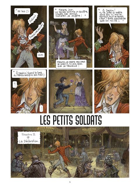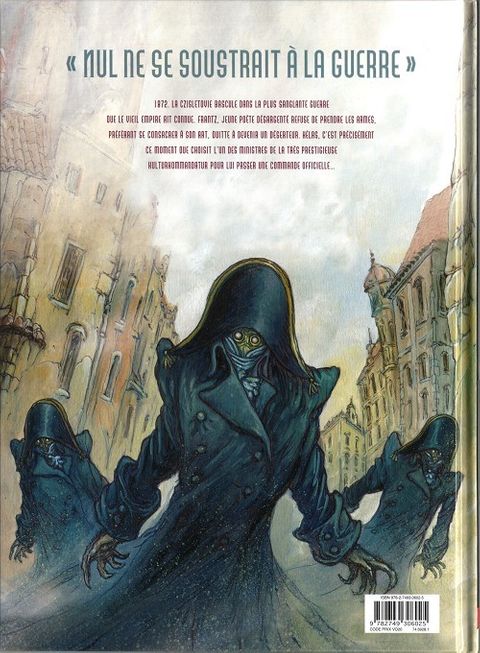 Voici ce que Frantz le poète répond à son ami Friedrich, à propos de la guerre déclarée à la surprise générale par le tout jeune Empereur Sigismond de Czisletovie contre la puissante Dalmaszie. Il faut dire qu'ils aiment débattre, ces deux bretteurs du verbe et frères ennemis ! Leur principal sujet jusqu'à présent était bien plus léger : à qui emporterait le coeur d'Héloïse, la jolie serveuse de leur taverne préférée.Mais l'avenir s'obscurcit, et tandis que Friedrich part à la guerre, Frantz est convoqué par les cruels hommes de l'ombre de l'empereur. Une fantaisie baroque et décalée servie par un dessin élégant et fouillé. un diptyque sur l'humanité, à ne pas manquer !