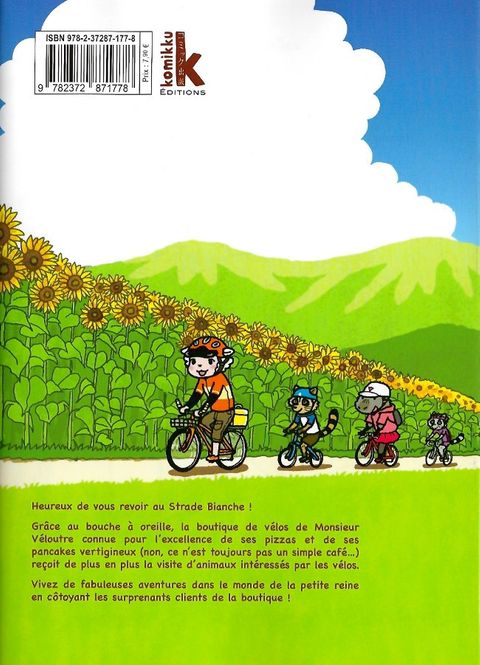 Heureux de vous revoir au Strade Bianche ! Grâce au bouche à oreille, la boutique de vélos de Monsieur Véloutre connue pour l'excellence de ses pizzas et de ses pancakes vertigineux (non, ce n'est toujours pas un simple café...) reçoit de plus en plus la visite d'animaux intéressés par les vélos. Vivez de fabuleuses aventures dans le monde de la petite reine en côtoyant les surprenants clients de la boutique !