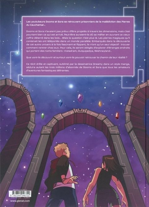 Les célèbres YouTubeurs Dooms et Sora se retrouvent prisonniers des réseaux sociaux !Alors que Dooms et Sora passent un doux après-midi au bois de Vincennes, les deux amis tombent par hasard sur des cristaux capables de les téléporter dans une nouvelle et étrange dimension! En un instant, ils se retrouvent prisonniers d'un monde où internet s'est matérialisé. Au fil de leur aventure, ils rencontrent les représentants d'entreprises loufoques telles que Gougueule, Ouiquipedya, ou FakeBook... Au-delà du choc, des gentilles engueulades et des blagues, Dooms et Sora ont une mission: s'échapper pour retrouver leur réalité!Grande aventure destinée à tous leurs fans Les Pierres de Cauchemar est un récit mêlant humour et fantastique dans un style aux frontières du manga. Parfois maladroits ou énervés, toujours drôles, les deux aventuriers-youtubeurs s'avèrent aussi courageux que curieux!