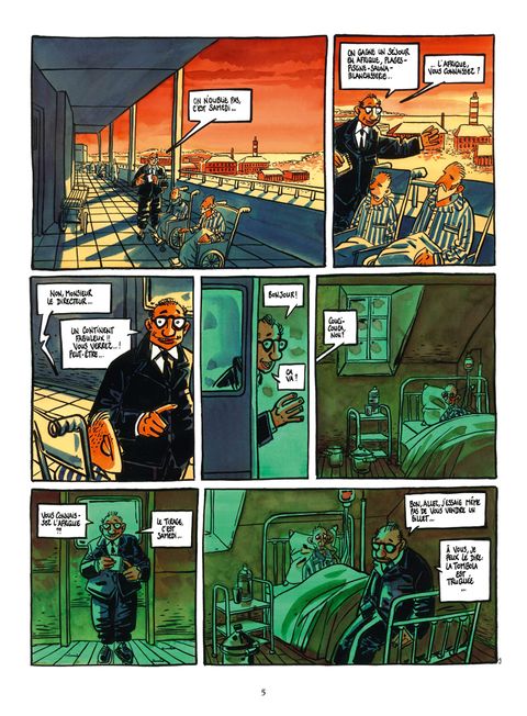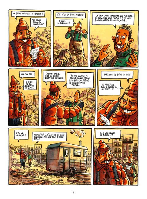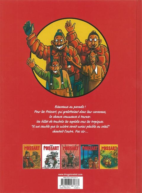 Heureux les pauvres d'esprit ! Les Poissart met en scène dans de courtes histoires une galerie de personnages truculents, répartis en trois groupes : les Poissart, une famille de pauvres vivant dans une caravane sur un terrain vague; les Landry, riches bourgeois habitant le proche quartier résidentiel huppé; et un sanatorium au directeur crapuleux et aux malades cadavériques. Difficile de savoir lesquels sont les plus à plaindre ou à blâmer... Le directeur du sanatorium qui développe les maladies dermatologiques d'un patient pour apprécier en esthète les différentes nuances de couleurs apparaissant sur son corps ? Le père Poissart qui dépense le petit pécule économisé pour les études des enfants afin d'emmener sa femme à la pizzeria ? Monsieur Landry qui invite des Africains faméliques à sa table pour inciter son fils à finir son assiette ? Comme souvent chez Tronchet, la peinture sociale corrosive confine au délire absurde... Mais c'est pour viser dans le mille et secouer nos esprits parfois sclérosés qu'il manipule ainsi en maître l'humour noir ! Les tomes 1à 4 des Poissart reprennent trois volumes édités par Albin Michel BD (Au bonheur des drames, Les Rois du rire et Pauvres mais fiers) dans une nouvelle présentation revue et corrigée par l'auteur. Les Poissart au Paradis ! est quant à lui une nouveauté, qui transporte tout ce beau monde en voyage organisé en Afrique...