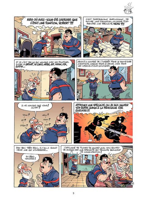 Ce n’est pas parce qu’on est des professionnels qu’on n’a pas droit à des formations. En plus, nos valeureux soldats du feu en ont grandement besoin. Car les spécialités, c'est pas ça qui manque chez les sapeurs : entre les interventions en milieu périlleux, le sauvetage en mer, les dangers chimiques ou nucléaire... tout le monde pourra choisir son domaine de compétences ! Même Robert. Mais bon, lui, sa compétence, c’est la sieste… et le poulet au caramel et noisettes !