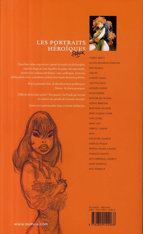 Dans leur valise " top secret ", parmi les traités de philosophie, sous les draps de leur chambre de palace dix sept étoiles, derrière les coulisses de théâtre : tous, politiques, écrivains, philosophes, stars, comédiens cachent leur bande dessinée préférée. Pour la première fois, ils dévoilent leurs préférences. Mieux : ils disent pourquoi. Difficile de les faire parler ? Pas quand c'est Frank qui revisite les univers des grands de la bande dessinée. Entrez avec gourmandise dans ce musée jubilatoire.