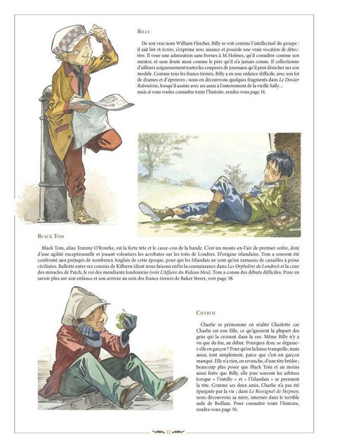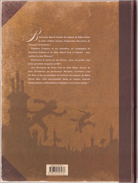 Des bas-fonds de Londres au 221b Baker Street, des plus célèbres affaires de Sherlock Holmes aux secrets du diabolique professeur Moriarty, ce magnifique livre de 64 pages vous plongera au coeur de l'univers de la fameuse équipe d'apprentis détectives de l'époque victorienne. Avec ses superbes illustrations originales signées David Etien et ses textes écrits par les scénaristes Djian et Legrand, cette véritable encyclopédie vous fera également découvrir, à travers trois courtes nouvelles, le passé de nos héros, ainsi que leur toute première enquête, sous la forme d'une bande dessinée inédite, L'Affaire du taxidermiste.