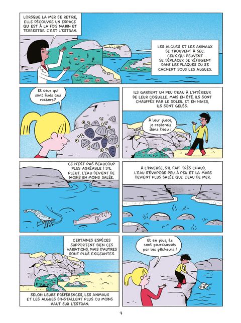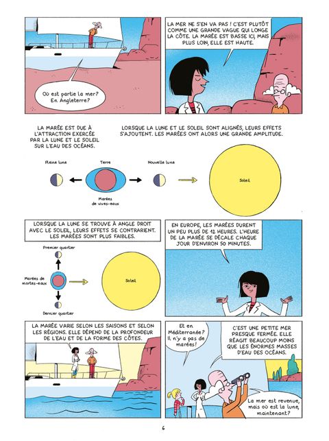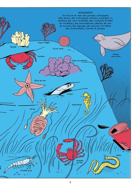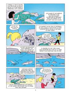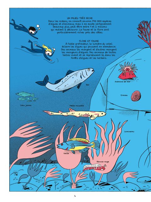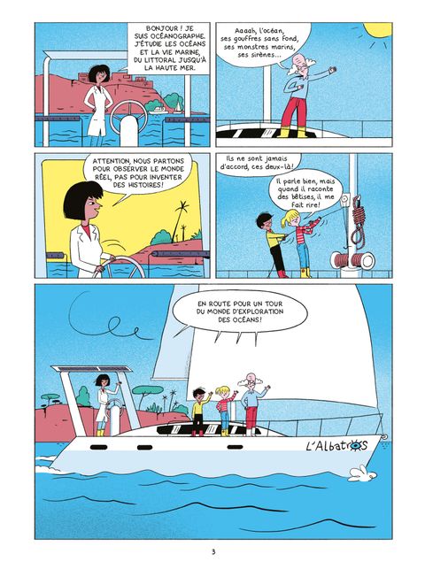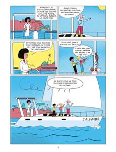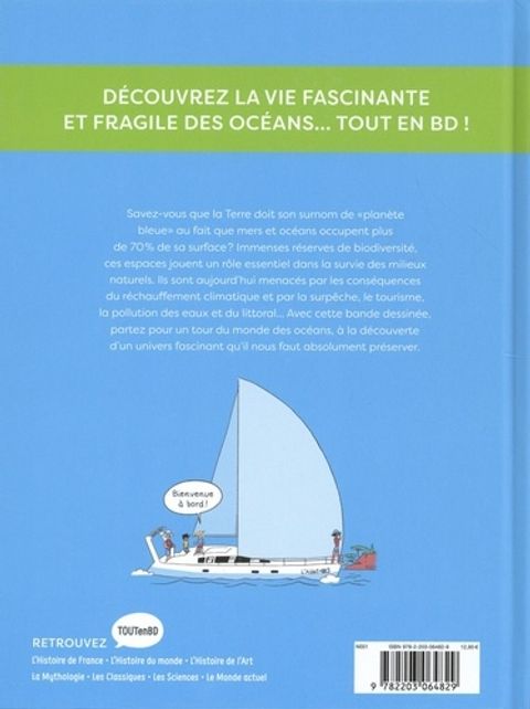 Après L'évolution et L'évolution de l'homme, une nouvelle incursion ludique dans le monde des sciences ! Les quatre personnages (une scientifique presque infaillible, deux enfants curieux et un médiateur pétri d'idées reçues) s'embarquent cette fois sur un voilier. De la Bretagne jusqu'à l'océan Pacifique, ils découvrent la vie marine à proximité des côtes, la formation des marées, la chaîne alimentaire du plancton aux requins, le relief des fonds marins, la beauté des récifs coraliens, mais aussi les effets du réchauchement climatique sur la banquise, la pollution visible et invisible, le continent de plastique et les menaces aiguës qui pèsent ainsi sur la biodiversité. Le chemin du retour est l'occasion d'envisager les mesures pour protéger les ressources à la fois si précieuses et fragiles des océans. Un propos essentiel, rendu vivant et drôle grâce à l'interaction entre des personnages hauts en couleur.