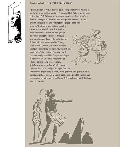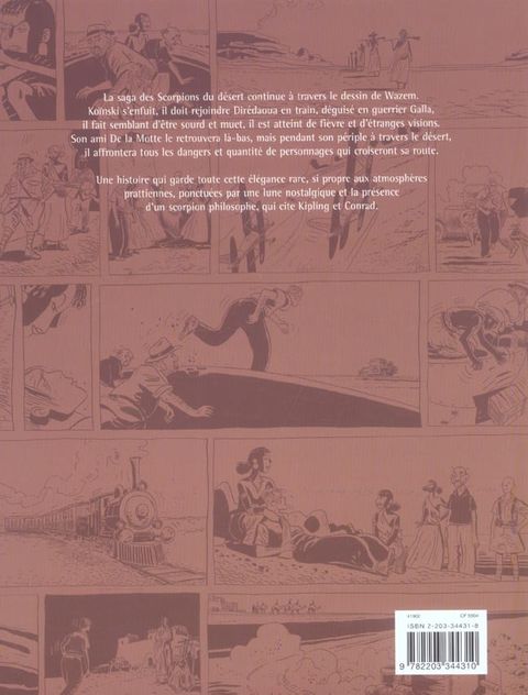 La saga des Scorpions du désert continue à travers le dessin de Wazem. Koïnski s'enfuit, il doit rejoindre Dirédaoua en train, déguisé en guerrier Galla, il fait semblant d'être sourd et muet, il est atteint de fièvre et d'étrangers visions. Son ami De la Motte le retrouvera là-bas, mais pendant son périple à travers le désert, il affrontera tous les dangers et quantité de personnages qui croiseront sa route. Une histoire qui garde toute cette élégance rare, si propre aux atmosphères prattiennes, ponctuées par une lune nostalgique et la présence d'un scorpion philosophe, qui cite Kipling et Conrad.