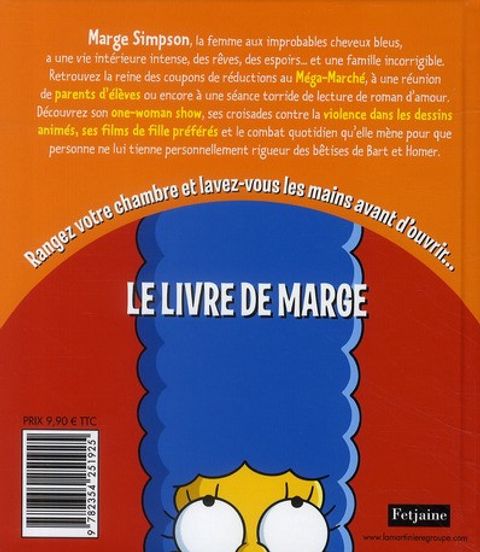Homer, voici enfin Marge et sa célèbre coiffure choucroute bleue ! Pour tout savoir sur la mère la plus déjantée de l'Amérique.<br />Marge Simpson, la femme aux improbables cheveux bleus, a une vie intérieure intense, des rêves, des espoirs... et une famille incorrigible.<br />Retrouvez la reine des coupons de réductions au Méga-Marché, à une réunion de parents d'élèves ou encore à une séance torride de lecture de roman d'amour.<br />Découvrez son one-woman show, ses croisades contre la violence dans les dessins animés, ses films de fille préférés et le combat quotidien qu'elle mène pour que personne ne lui tienne rigueur des bêtises de Bart et Homer.<br />