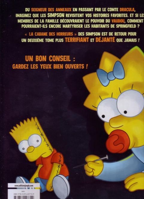 Du seigneur des anneaux en passant par le comte Dracula, imaginez que les simpson revisitent vos histoires favorites. Et si les membres de la famille découvraient le pouvoir du vaudou, comment pourraient-il encore martyriser les habitants de Springfield ? " La cabane des horreurs " des Simpson est de retour pour un deuxième tome plus terrifiant et déjanté que jamais ! Un bon conseil : gardez les yeux bien ouverts !