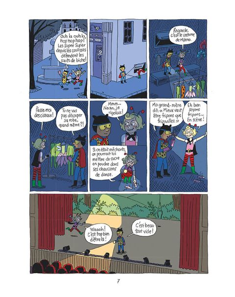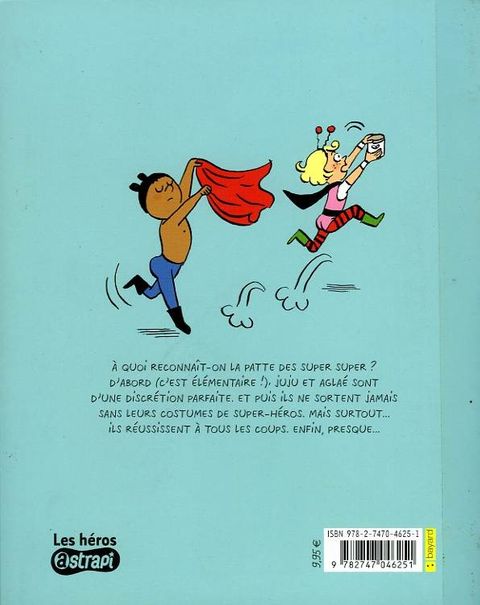 Des super-héros sans superpouvoirs, c’est quand même très compliqué ! Surtout que Juju et Aglaé ne sont pas d’accord avec Spiderman : pas besoin d’un grand pouvoir pour assumer de grandes responsabilités ! Alors dès qu’ils peuvent aller gratter un mystère, rendre service ou tout simplement défroisser leurs costumes lorsque la nuit est tombée, nos deux héros s’en donnent à coeur joie. Super-Aglaé et Super-Juju font partie de ces héros qui n’endossent leur uniforme de sauveurs que la nuit ! Quand le soir tombe, ils vont « faire le bien » dans la ville ou tout au moins essayer, car leurs capes n’ont en fait rien de magique !