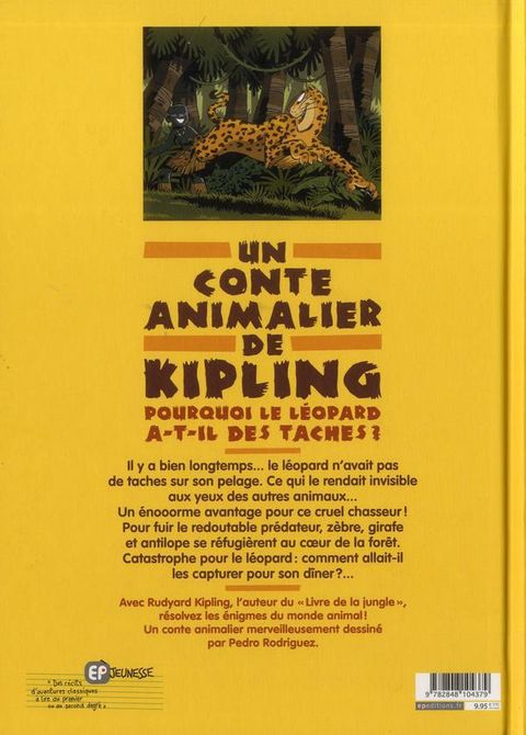 Il y a bien longtemps, le léopard n'avait pas de taches sur son pelage couleur de sable. Ce qui le rendait invisible aux yeux des autres animaux... Un énooorme avantage pour ce cruel chasseur ! Sauf qu'un jour, un jeune garçon eut cette géniale idée : lui ajouter des taches, pour permettre à ses proies de le voir de loin... Mais qui osera s'approcher du redoutable prédateur ?... Avec l'auteur du Livre de la jungle, résolvez les énigmes du monde animal !
