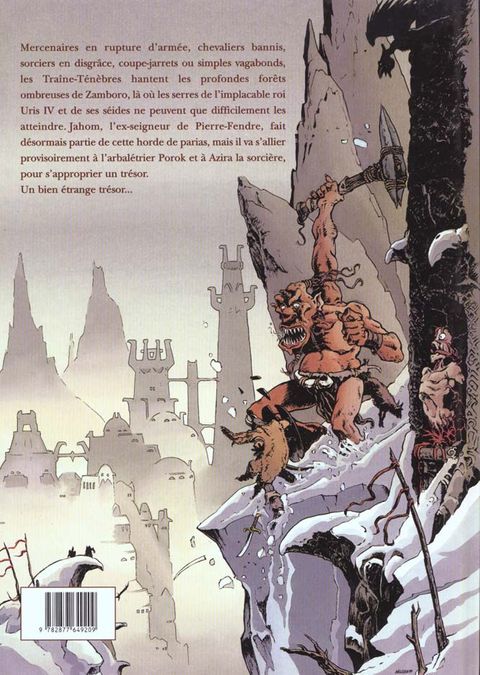 Mercenaires en rupture d'armée, chevaliers bannis, sorciers en disgrâce, coupe-jarrets ou simples vagabonds, les Traîne-Ténèbres hantent les profondes forêts ombreuses de Zamboro, là où les serres de l'implacable roi Uris IV et de ses séides ne peuvent que difficilement les atteindre. Jahom, l'ex-seigneur de Pierre-Fendre, fait désormais partie de cette horde de parias, mais il va s'allier provisoirement à l'arbalétrier Porok et à Azira la sorcière, pour s'approprier un trésor. Un bien étrange trésor.