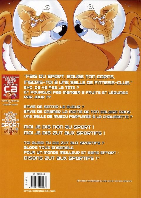 Vous vous prépariez à vous inscrire une nouvelle année à votre salle de gym ? Laissez tomber, une bonne grosse paresse assumée est bien plus préférable à l'effort contraint, et Jim va s'évertuer de vous le démontrer avec mille et un exemples, tous plus de mauvaise foi les uns que les autres. La preuve que c'est très très "con" le sport ? C'est rien que des sportifs qui en font. Marre de subir la pression du sport ? Vous êtes une grosse larve et vous n'aimez pas vous bouger ? Cet album a été écrit pour vous !