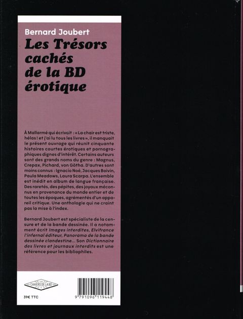 A Mallarmé qui écrivait : "La chair est triste, hélas ! et j'ai lu tous les livres". , il manquait le présent ouvrage qui réunit cinquante histoires courtes érotiques et pornographiques. Certains auteurs sont des grands noms du genre : Magnus, Crepax, Pichard, Von Gotha. D'autres sont moins connus : Ignacio Noe, Jacques Boivin, Paula Meadows, Laura Scarpa. L'ensemble est inédit en album de langue française. Des raretés, des pépites, des joyaux méconnus en provenance du monde entier et de toutes les époques, agrémentés d'une présentation de chaque auteur ainsi que du contexte de parution. Une anthologie qui sort des sentiers battus. Bernard Joubert est l'un des plus grands spécialistes mondiaux de la censure et de la bande dessinée érotique. Il a notamment écrit Images interdites (éd. Alternatives), Elvifrance l'infernal éditeur (éd. United Dead Artists), Panorama de la bande dessinée clandestine (éd. de la Musardine). Son Dictionnaire des livres et journaux interdits (éd. du Cercle de la librairie) est une référence.