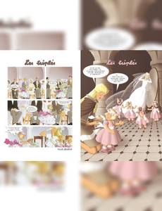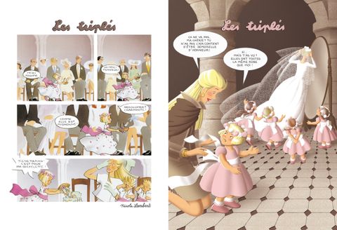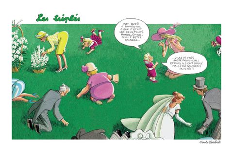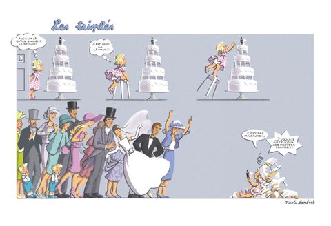 Demoiselle de bonheur ! Le rêve de chaque petite fille ! Par contre les garçons, qui n'ont pas très envie de se déguiser et de porter la traîne, scandalisent leur mère en demandant : - Combien c'est payé ??? Les enfants courent partout dans les mariages... Les grands, très occupés, leur lancent des coups d'oeil distraits sans se douter des aventures inoubliables que vivent les petits. Tout d'abord la cérémonie, intrigante avec ces vieilles dames qui pleurent (pourtant elles sont bien trop vieilles pour épouser le marié), les flots de tulle du voile (le petit Triplé se propose d'en couper un morceau pour que la mariée puisse marcher plus facilement), le riz que l'on jette à la sortie (heureusement, il n'est pas cuit ! ). Le buffet surtout, tant de bonnes choses à manger (et puis, renseignement pris auprès du maître d'hôtel, c'est gratuit !!! ). Les petits fours, les pains-surprise, la pièce montée avec les petits mariés au sommet (que la triplette va essayer d'attraper... avec quelques dégâts ! Et toutes les bêtises que vous disent les grandes personnes : Comme vous avez grandi ! C'est incroyable ! (Qu'est-ce qu'ils diraient si on avait rapetissé ! ) Ce nouvel album des Triplés nous raconte ces dessous du mariage, une histoire parallèle vue par les enfants,
