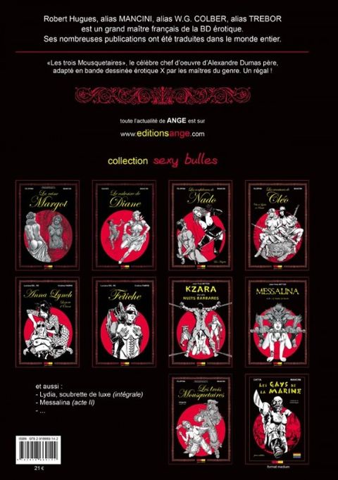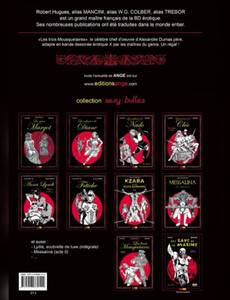 Les trois Mousquetaires, le célèbre roman d'Alexandre Dumas père, adapté en BD érotique X par deux maîtres du genre. Robert Hugues alias Mancini alias W.G. Colber alias Trebor est le pape de la BD érotique française. Avec plus de 40 titres tirés et vendus à des dizaines de milliers d'exemplaires chacun et aujourd'hui paradoxalement très rares et recherchés, des traductions dans une dizaine de pays, cet auteur phare, directement sorti de l'âge d'or de la BD, nous revient en force avec, pour commencer, l'édition de ses chefs d'oeuvres graphiques incroyablement inédits, réalisés au début des années 90. Celui-ci, Les trois mousquetaires, est scénarisé par Henri Filippini, qu'on ne présente plus.