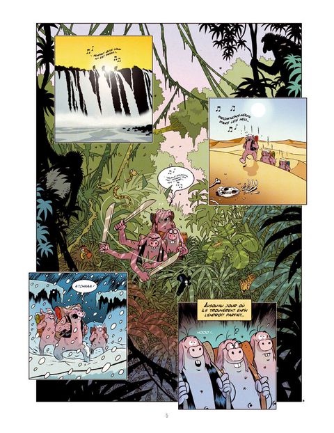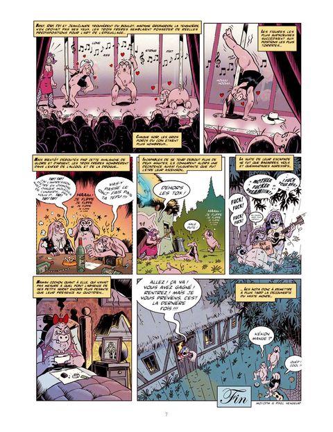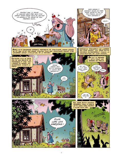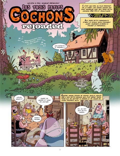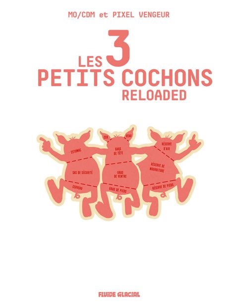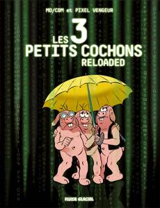 S'il y a bien un marronnier dans la bande dessinée, c'est les trois petits cochons. Et pour cause. Ça plaît toujours ! Et plus c'est dingue et plus ça plaît, les petits cochons. Question dinguerie, il faut bien avouer que là, on est servis. À la lecture de cette fable en 7 chapitres, même Tex Avery n'en mènerait pas large. Sous le trait splendide de Pixel Vengeur (véritable confiture aux cochons), les trois créatures friandes de glands (quand est-ce qu'on mange ?), partent entre autres à la recherche de leur père, porc écologiste des années 70 qui s'était naguère enchaîné à une ogive nucléaire pour finir mué en pieuvre sur l'atoll de Mururoa. On situe un peu mieux le contexte, n'est-ce pas ? À part ça, oui, il y a un grand méchant loup (atteint d'un cancer des poumons), des petites maisons en paille, en bois etc. À travers cet exercice de style, inutile de préciser que Mo/CDM (au scénario) a dépassé toutes les bornes. Heureusement pour l'éditeur, la ligue de défense des petits cochons n'a pas encore été fondée.