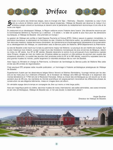 À l'instar des Voyages d'Alix dans le monde antique, la collection des Voyages de Jhen invite ses lecteurs à explorer l'époque médiévale, dans les pas du personnage créé par Jacques Martin. Chaque album propose une découverte documentaire très complète, par l'image et les mots, d'un peuple, d'un lieu ou d'une contrée du Moyen-Âge. Ce nouvel épisode des Voyages de Jhen convie les fidèles de la série comme les amateurs du Moyen Âge à découvrir ou redécouvrir un important foyer historique de la foi chrétienne en Europe : l'Abbaye de Stavelot, très ancien monastère bénédictin implanté en Belgique à proximité de Liège. Soigneusement mis en images par Marco Venanzi et Mathieu Barthélémy, et soutenu par une sélection de photographies, l'album parcourt la longue existence du site, depuis les premiers temps du monastère au VIIe siècle jusqu'au seuil de l'époque contemporaine. La succession des édifices et des ajouts architecturaux au fil du temps fait l'objet d'une chronique fouillée, avec une attention particulière portée à la période de l'an mil, qui marque l'apogée de l'abbaye sous la direction de l'abbé Poppon puis de l'un de ses principaux successeurs Wibald. L'abbaye périclitera ensuite lentement à compter du XIIe siècle, mais ce qu'il en subsiste aujourd'hui demeure un site historique de premier plan.
