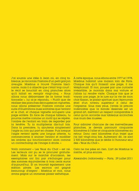 Méduz, l'aigle, est en chasse. Il ne chasse pas pour lui, mais bien pour son maître. Cette très belle histoire, poétique et mystique, est la première création du couple Jodorowsky/Moebius. L'alchimie particulière qui l'anime, dans le dialogue incessant entre dessins et texte, l'alternance entre deux points de vue, font des Yeux du chat un ouvrage à part de ce duo de génie.