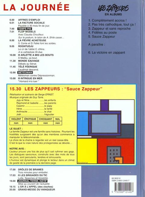 Le sujet la famille zappeur est une famille sans histoires. Pourtant les hostilités surgissent dès qu'un des membres commence à manipuler la télécommande . Le choix de la chaîne à regarder est un réel casse-tête. C'est là que la vraie nature des protagonistes se dévoile . Notre avis : L'auteur prouve une fois de plus qu'il sait rythmer ses gags. les dialogues savoureux, construits avec des mots de tous les jours, sont percutants, tendres et émouvants. L'humour est dynamique et plonge le lecteur dans un climat de gaieté de la première à la dernière page.