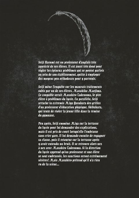Tricheries, chahut, obscénités, brimades, chantages, parents difficiles à gérer. À chaque problème sa solution ?! Mais comment y faire face lorsqu'ils ne cessent de s'accumuler ? Seiji Hasumi, lui, sait toujours comment s'y prendre.