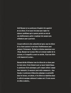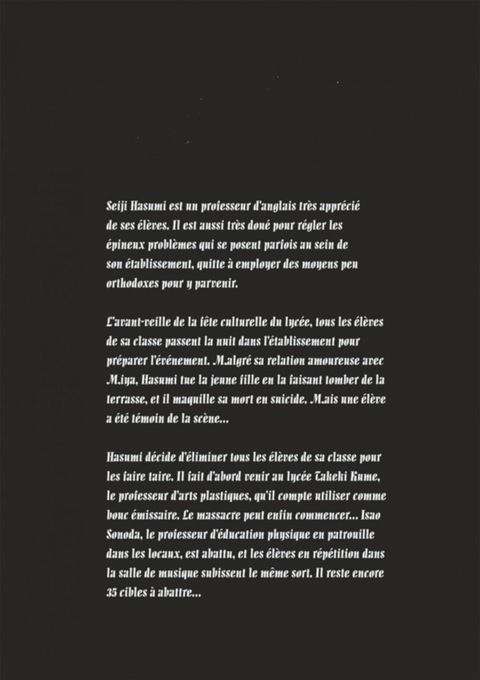 Le lycée s'est transformé en un véritable terrain de chasse ! Après avoir veillé avec un soin tout particulier à l'éducation de ses élèves, le professeur se résout à les éliminer un par un... En guise de discours d'adieu, les coups de feu retentissent... Seiji Hasumi n'est pas du genre à se laisser attendrir !