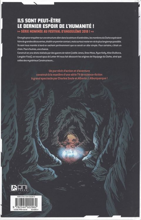 Ils sont peut-être le dernier espoir de l’humanité Envoyés pour enquêter sur une structure alien dans la ceinture d’astéroïdes, les membres du Clarke espéraient faire de grandes découvertes, établir un premier contact, mais surtout rester en vie le plus longtemps possible. Ils sont tous montés à bord en sachant pertinemment que ce ne serait qu’un aller simple. Pour certains, c’était un choix. Pour d’autres, une chance. Construit en one shots réalisés par des guests de talent (Joëlle Jones, Drew Moss, Ryan Kelly, Alise Gluškova, Langdon Foss), ce nouvel opus de Letter 44 nous fait découvrir les origines de l’équipage du Clarke, ainsi que celles des mystérieux Constructeurs…