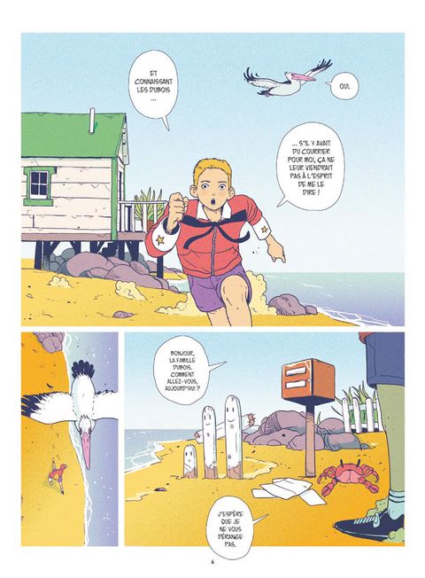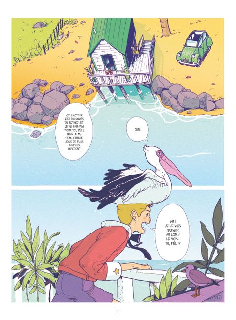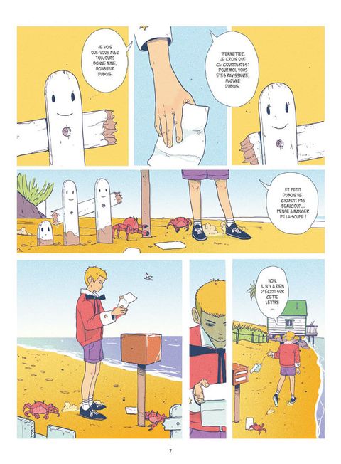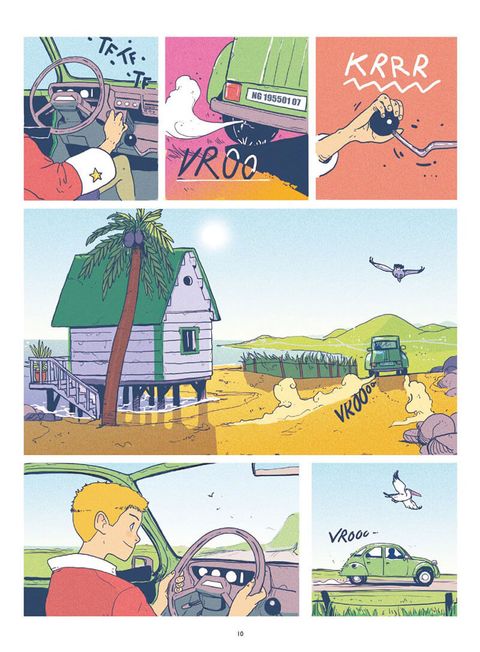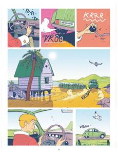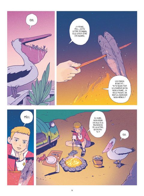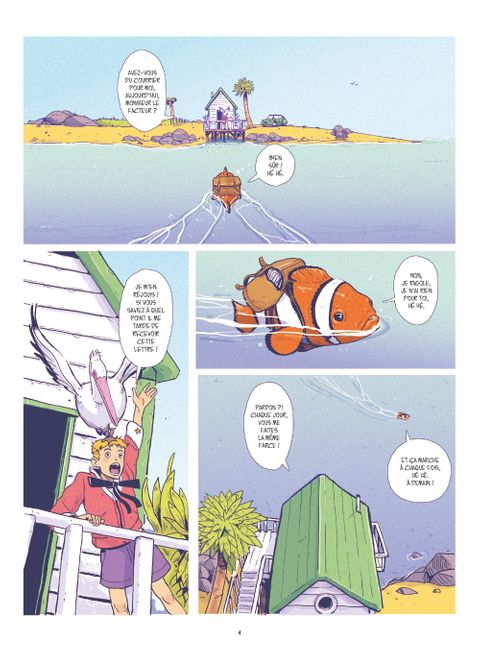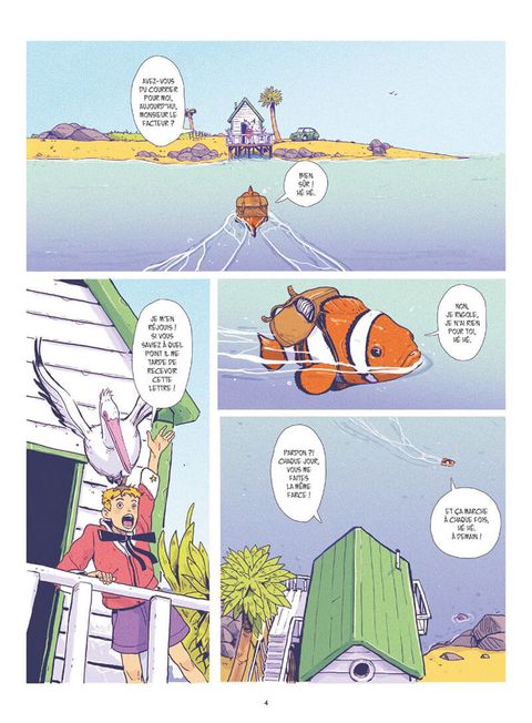 Les aventures corrosives d'Iode à la recherche de sa mère.Comme tous les matins, Iode attend impatiemment cette lettre que le facteur tarde à lui apporter. Surement une blague de ce farceur de poisson-clown qui s'amuse à livrer son courrier aux voisins... Ou peut-être a-t-il simplement été égaré? Il n'y a qu'un seul moyen d'en avoir le coeur net: se rendre en ville. Embarqué dans sa petite auto vert pomme, Iode fait la rencontre de Frangine, une autostoppeuse au caractère bien trempé qui effectue une livraison pour le compte du mystérieux groupe mafieux «la pieuvre». Seulement, lorsque cette dernière décide de lui fausser compagnie, le jeune garçon s'inquiète et décide naïvement de partir à sa recherche. Sans le savoir, Iode vient de mettre les pieds dans une affaire qui le placera au coeur d'un terrible drame.Sur l'île du soleil où poissons et humains cohabitent, mafieux sans vergognes et policiers incompétents sont monnaie courante. Une cavalcade absurde naviguant entre humour, douceur et drame mélancolique. Un premier roman graphique réalisé par un prodige du dessin nourri au travail de Hayao Miyazaki. Un récit où la rondeur du dessin et la beauté irradiante des couleurs forment paradoxalement une oeuvre tragique qui perturbera les âmes les plus sensibles.