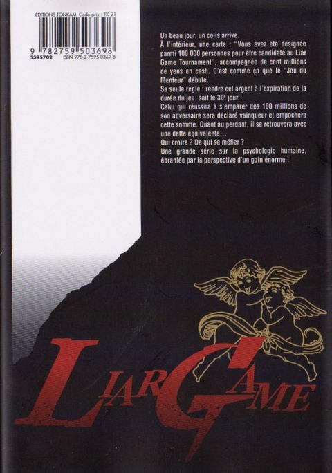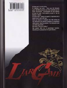 Félicitations, vous venez de remporter 100 000 000 de yens en vous inscrivant au Liar Game ! - C'est par cette carte anodine accompagnant cette somme indécente que la vie de Nao Kanzaki a basculé. Ce jeu où le vainqueur est le menteur le plus habile causera sa perte. Seul Akiyama, un arnaqueur repenti pourrait l'aider à s'en sortir... si tant est qu'il accepte de l'aider !