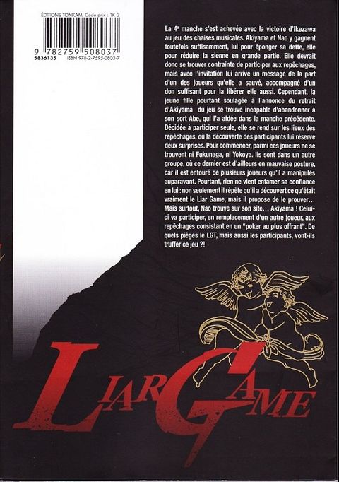 La quatrième manche a pris fin avec la victoire d’Ikezawa. Chacun des perdants reçoit une invitation aux repêchages. Regrettant de n’avoir pu sauver Abe qui l’a aidée dans la manche précédente, Nao annonce qu’elle y participera seule. Arrivée sur les lieux, elle y trouve plusieurs adversaires affrontés auparavant et surtout… Akiyama, pourtant censé ne plus être endetté ! Tous apprennent alors que l’épreuve s’appellera « le poker au plus offrant ». Qu’arrivera-t-il lors de ce nouveau jeu de dupes ?