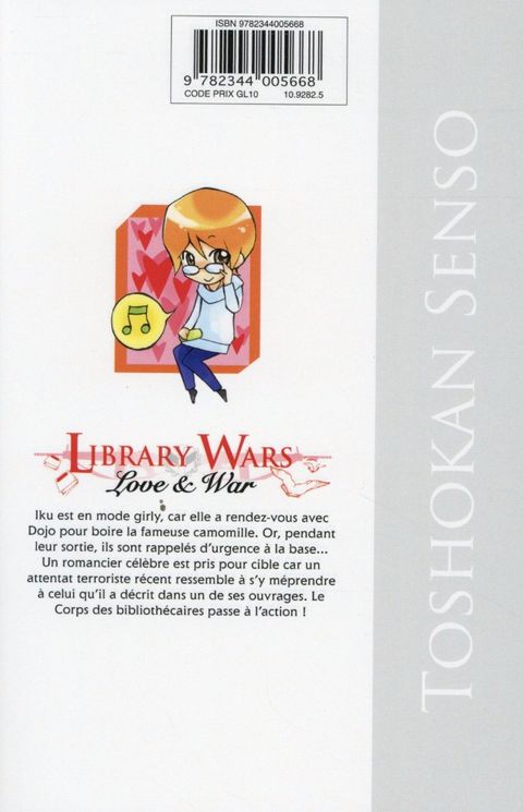 Iku est en mode girlie, car elle a rendez-vous avec Dojo pour boire la fameuse camomille. Or, pendant leur sortie, ils sont rappelés d'urgence à la base ?! Un romancier célèbre est pris pour cible car un attentat terroriste venant de se produire, où un hélicoptère s'est lancé contre une centrale nucléaire, ressemble à s'y méprendre à celui qu'il a décrit dans un de ses ouvrages. Le Corps des bibliothécaires passe à l'action !