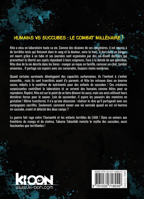 Humains vs succubes : le combat millénaire ! Nito a vécu en laboratoire toute sa vie. Comme des dizaines de ses congénères, il est soumis à de terribles tests qui finissent dans le sang et la douleur, voire la mort. Il dort dans un hangar, est nourri grâce à un tube et ses journées sont organisées par des soi-disant docteurs qui promettent la liberté aux sujets répondant à leurs exigences. Face à la dureté de son quotidien, Nito rêve de la vie décrite dans les livres : manger un repas en famille, caresser un chat, tomber amoureux... Il partage ses espoirs avec ses camarades, toujours moins nombreux. Quand certains survivants développent des capacités surhumaines, ils l'invitent à s'enfuir ensemble... mais ils sont transférés avant d'y parvenir, et Nito les retrouve dans un énorme cocon, réduits à la condition de nutriments pour des enfants de succubes ! Ces créatures surpuissantes contrôlent le laboratoire et se servent des humains comme hôtes pour se reproduire. Repéré, Nito est sur le point de se faire dévorer lui aussi, mais ses amis utilisent leurs dernières forces pour le sauver. Loin de succomber, il aspire les pouvoirs des monstres en gestation ! Même transformé, il n'a qu'une obsession : réaliser le rêve qu'il partageait avec ses compagnons sacrifiés. Seulement, comment mener une vie normale quand on est mi-homme mi-succube, craint et détesté des deux camps ? La guerre fait rage entre l'humanité et les enfants terribles de Lilith ! Dans un univers aux frontières du manga et du cinéma, Takuma Tokashiki revisite le mythe des succubes, aussi fascinantes que terrifiantes !