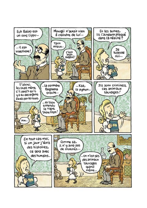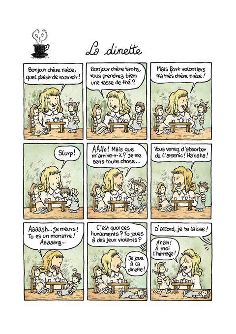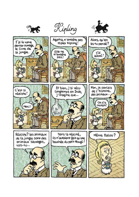 Avant d'être la célèbre écrivaine que l'on connaît, Agatha Christie a, elle aussi, été une enfant. Et pas n'importe quelle enfant ! Chez elle, tout est matière à mener l'enquête, à déchiffrer des énigmes et rien n'est plus amusant qu'une scène de crime nimbée de mystères ! Ainsi, elle réécrità sa manière les contes les plus célèbres (l'histoire de Boucles d'or n'était-elle pas une machination de Petit Ours pour avoir plus de soupe ? La Sorcière de Blanche Neige est-elle la vraie méchante de l'histoire ? ), transforme un thé entre poupées en scène de crime, et invente même le Cluedo à partir de sa maison de poupée ! Nous apprenons également qui était Miss Marple avant de devenir la célèbre détective des romans d'Agatha Christie, et c'est d'ailleurs elle qui nous révèle les solutions des enquêtes dissiminées tout au long du livre... Une fois encore, William Augel offre une bande dessinée à la fois enrichissante et amusante, emplie d'humour et de tendresse !