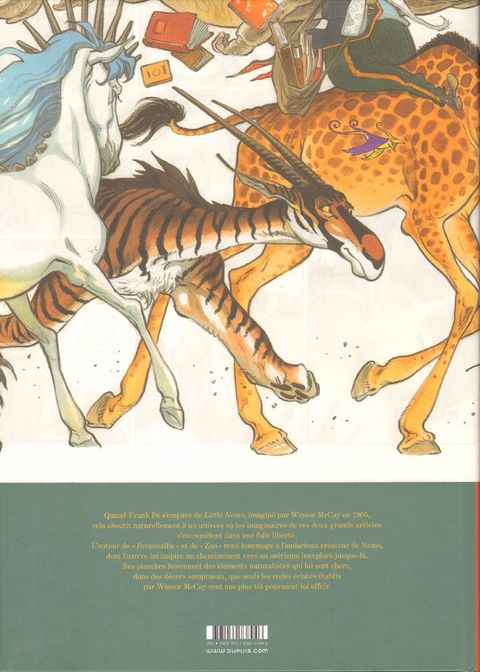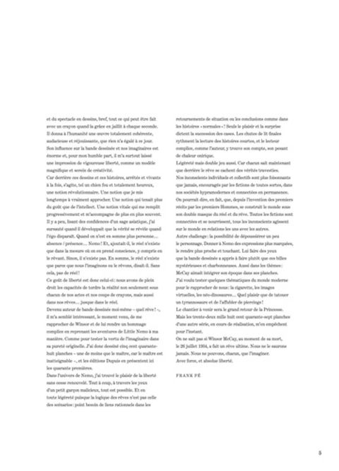 Quand Frank Pé s'empare de "Little Nemo", le petit garçon rêveur créé par Winsor McCay en 1905 pour le New York Herald, c'est pour le promener dans son imaginaire poétique et naturaliste, pour l'inviter d'un siècle à l'autre à poursuivre ses voyages oniriques à la découverte des rêves d'un autre artiste. A l'origine, ces planches ont été publiées aux éditions Toth sous forme de deux ouvrages de luxe. Elles sont nées d'un défi lancé par un galeriste à l'auteur. "Et si tu faisais tes propres pages de Little Nemo ? " Ce dernier s'est facilement laissé convaincre de replonger dans l'oeuvre révolutionnaire de Winsor McCay, le dessinateur américain qui aimait jouer des échelles et de la narration en explosant littéralement le cadre convenu de la bande dessinée. Frank Pé s'approprie cette grammaire dans un hommage magistral à la couleur directe et en grand format. Il livre alors, sous la forme d'une série de rêves traversés par ses réflexions personnelles, une véritable ode à la nature, à l'enfance, à l'innocence, à la vie.