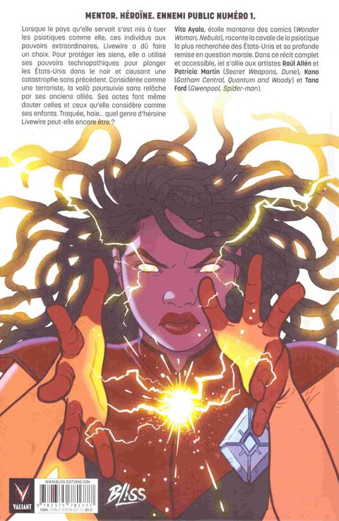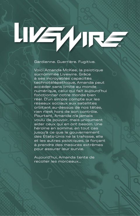 Lorsque le pays qu’elle servait s’est mis à traquer et tuer les psiotiques comme elle, ces humains aux pouvoirs extraordinaires, Livewire a dû faire un choix. Pour protéger les siens, elle a utilisé ses pouvoirs technopathiques pour plonger les États-Unis dans le noir et causer une catastrophe sans précédent. Considérée comme une terroriste, elle est maintenant poursuivie sans relâche par ses anciens alliés. Parmi les psiotiques même, ses actes font douter celles et ceux qu’elle considère comme ses propres enfants. Traquée, haïe… quelle genre d’héroïne Livewire peut-elle encore être ? Vita Ayala, étoile montante des comics (Wonder Woman, Bitch Planet) raconte la cavale de la psiotique la plus recherchée des Etats-Unis et sa profonde remise en question morale. Dans ce récit complet et accessible, Iel s’allie aux artistes Raul Allén et Patricia Martín (Wonder Woman, Eternal Warrior), Kano (Gotham Central, Quantum and Woody) et Tana Ford (Silk, Gwenpool, Spider-man). Contient maxi-série Livewire #1-12.
