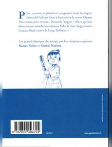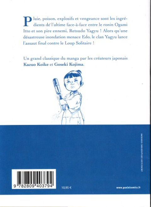 Pluie, poison, explosifs et vengeance sont les ingrédients de l'ultime face-à-face entre le ronin Ogami Itto et son pire ennemi, Retsudo Yagyu ! Alors qu'une désastreuse inondation menace Edo, le clan Yagyu lance l'assaut final contre le Loup Solitaire ! Un grand classique du manga par les créateurs japonais Kazuo Koike et Goseki Kojima.