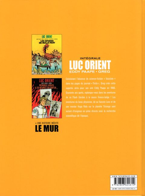 Suite et fin de l'intégrale des aventures du Flash Gordon franco-belge. Elle se termine par un certain nombre d'histoires courtes parues dans les trimestriels «Tintin Sélection» et «Super Tintin».. Luc Orient et ses amis devront y affronter d'étranges robots cachant les sombres desseins d'un savant fou, puis démêler le mystère d'un tableau qui rend fou ou bien encore voyager dans le passé pour résoudre une enquête vieille de neuf ans. Ce qui n'empêche pas le héros de Greg et Paape d'être toujours en avance sur notre temps ! Ce Tome 5 reprend les titres suivants: «Les Spores de nulle part», «Rendez-Vous à 20 Heurs en Enfer» et les premières planches d'une histoire restée inachevée, «Le Mur»...